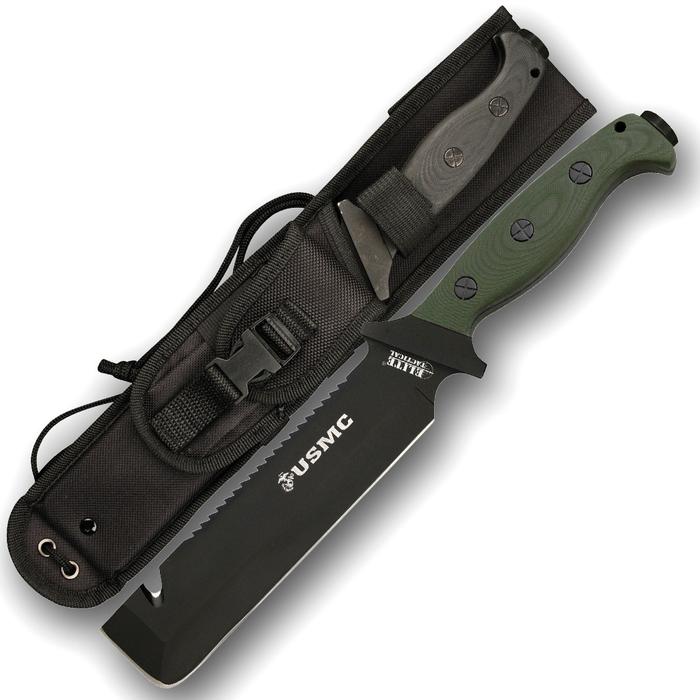Jarhead Fixed Survival Knife is the perfect blade for your next camp out or tactical operation. The 440 extended tang stainless steel, chisel blade has a black finish, a Sawback, and a wire cutter. The handle is made of green Micarta that features a stainless steel guard and pommel. It comes with a black nylon belt sheath that has a front pouch, black nylon leg ties, and a protective insert. Licensed by the United States Marine Corps.