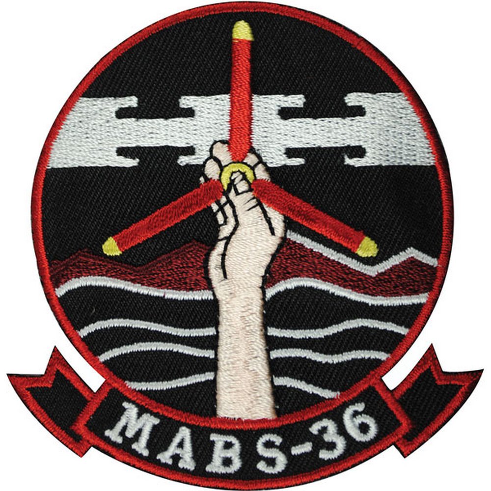 This MABS-36 Patch represents Marine Air Base Squadron 36. The black, red, and silver patch shows an arm holding a propeller into what appears to be barbwire fencing.