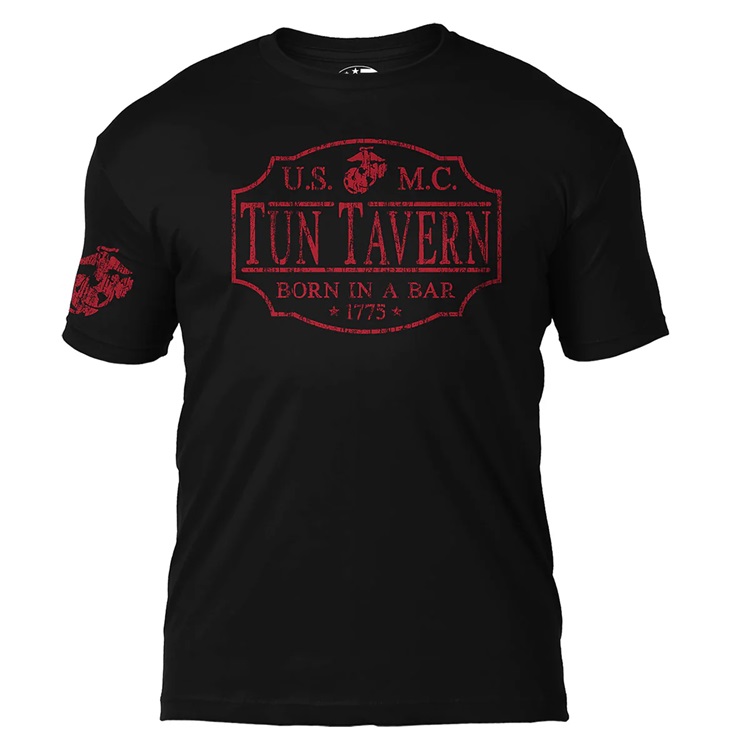 The front design proudly displays “Tun Tavern,” “Born in a Bar,” and “1775,” along with the iconic Marine Corps Eagle, Globe, and Anchor (EGA) emblem on the front and sleeve. Crafted from heavy weight pre-shrunk cotton, this tagless tee offers a soft, comfortable feel with a standard fit.