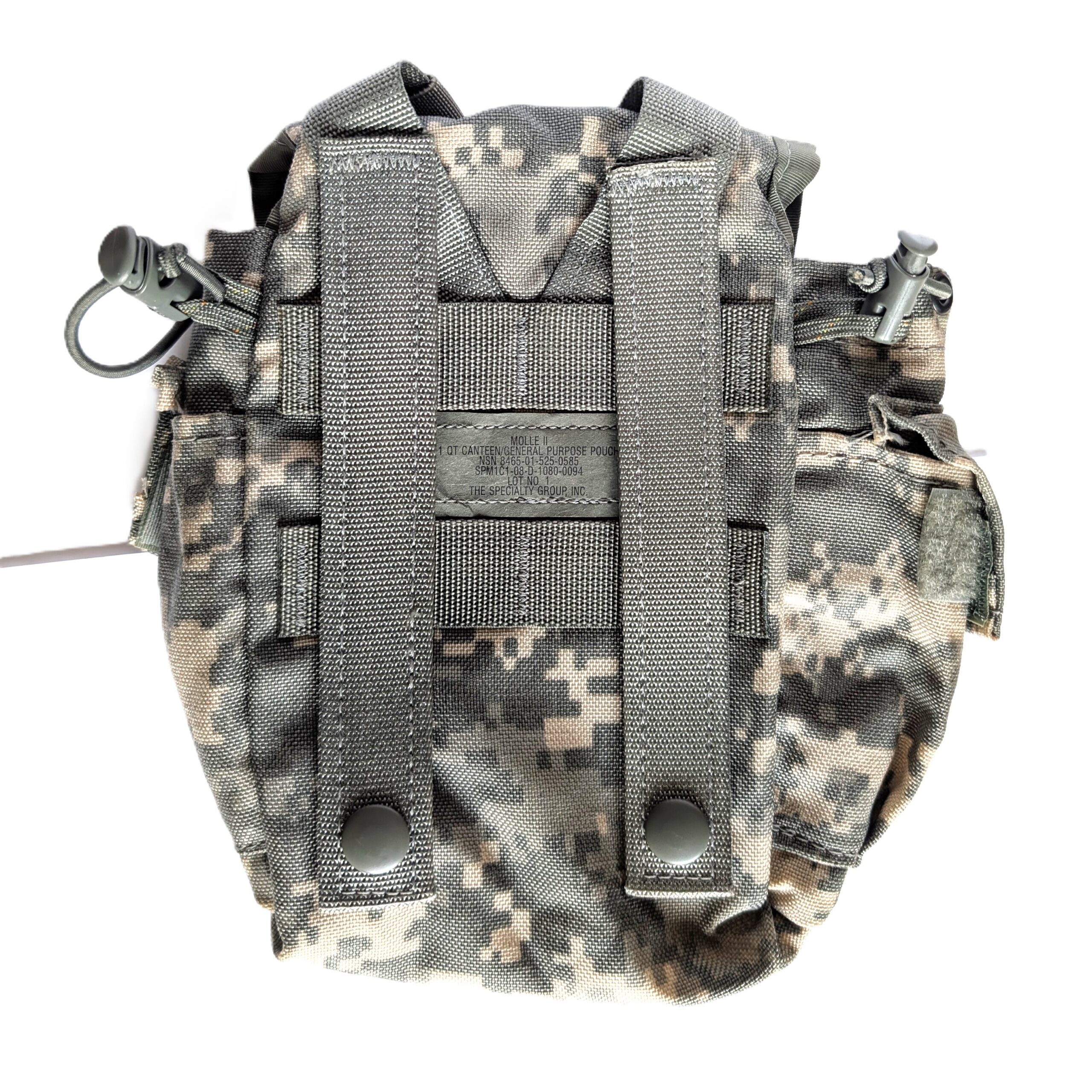 This US Army UCP Camouflage 1 Qt Canteen Cover / General Purpose Pouch can hold a 1 qt canteen with cup and field stove, or it can be used as a general purpose pouch. The main pocket comes with a top flap with a quick-release buckle closure with two compression draw cords. The pouch also comes with two outside side pockets with Velcro closure for holding water purification tablets, bandages or other field necessities. These canteen covers are made with rugged Cordura nylon and are MOLLE compatible. Made in USA.