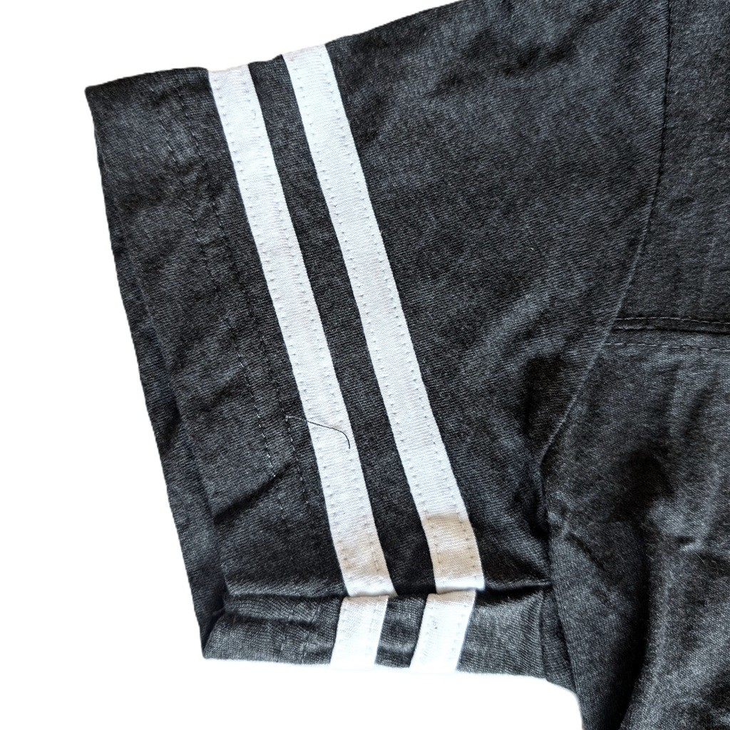 • Smoke Gray tee with athletic sleeve stripes